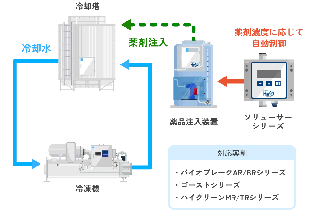 薬剤濃度調整管理装置は、冷却水中の薬剤濃度を常時監視し、薬剤濃度に応じて薬剤注入装置を自動制御します。