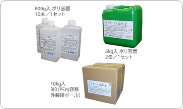 除菌・洗浄剤「バイオシスOP-2」は強力な殺菌効果を持ち、設備を運用しながらバイオフィルムの除去やレジオネラ属菌の殺菌が可能です。※第5版 レジオネラ症防止指針では、冷却塔の定期的な薬剤洗浄による対策が必要不可欠とされています。
